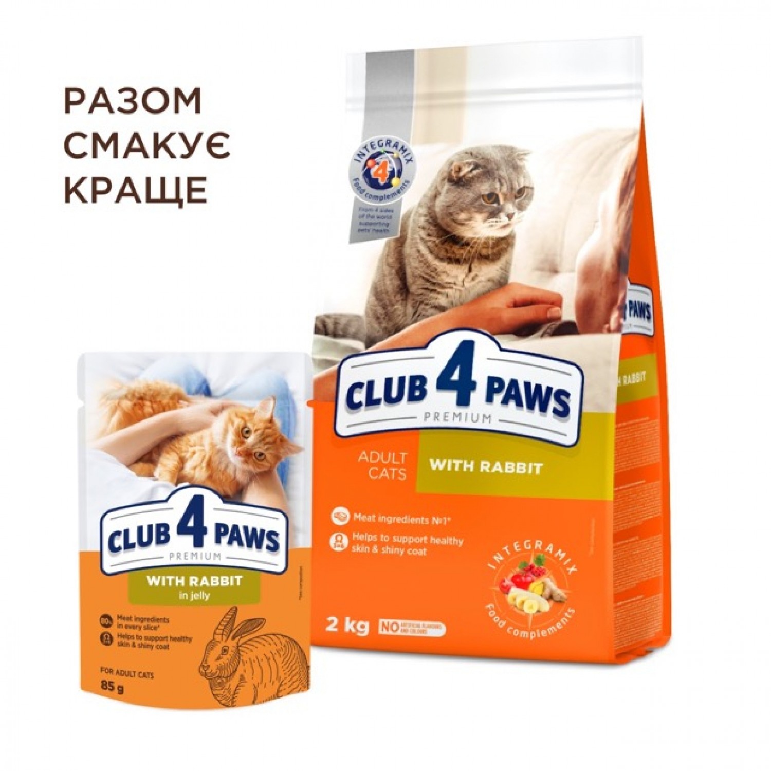 - Формула 8,5/5 оптимальна за вмістом білків і жирів, що робить вологий корм із кроликом Клуб 4 Лапи для котів ідеальним для щоденного меню.