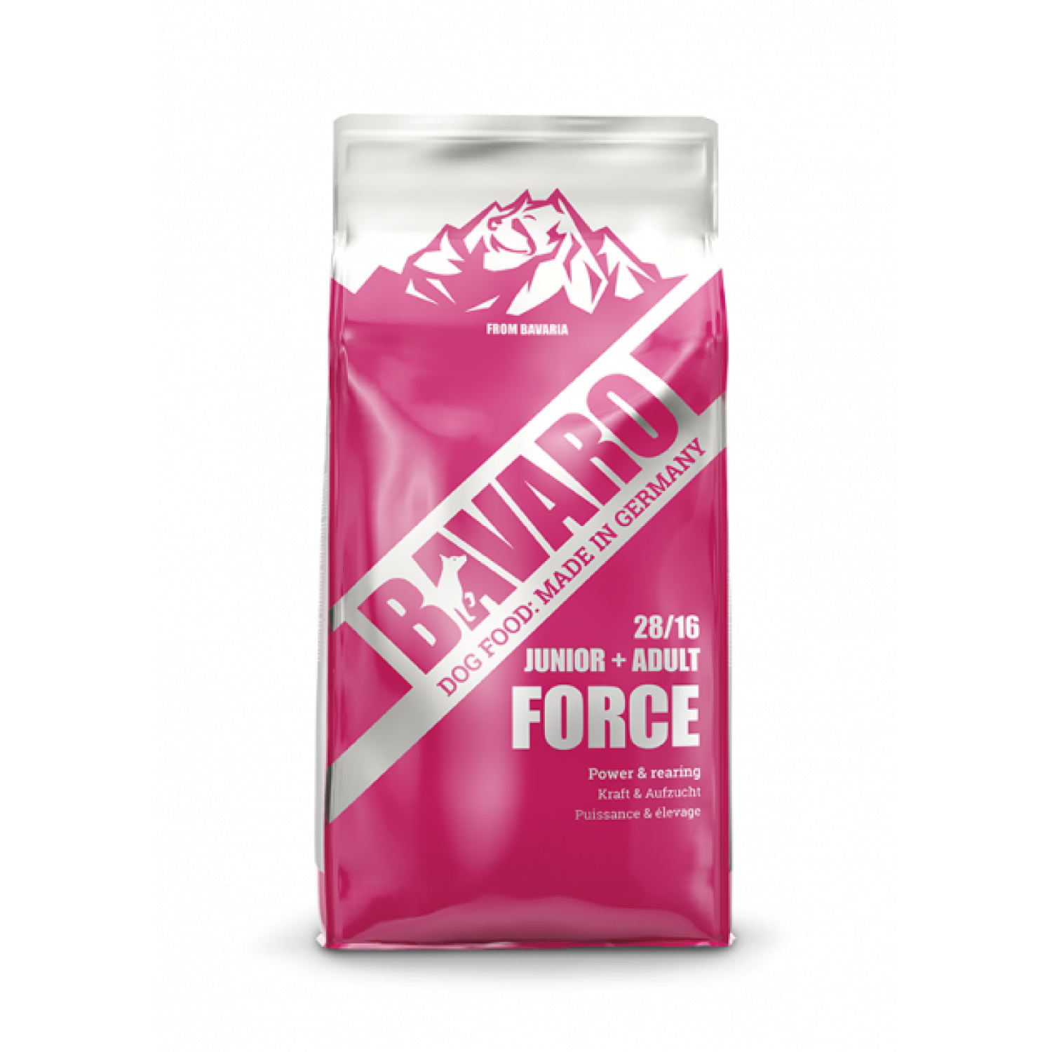 BAVARO Force 28/16 – сухий корм преміум класу для молодих та дорослих робочих собак. Корм розроблений для собак з високою потребою в енергії через важку фізичну роботу. Завдяки особливому співвідношенню протеїну та жиру, цей корм також може використовуватися для вирощування молодих собак з 2-го місяця життя.