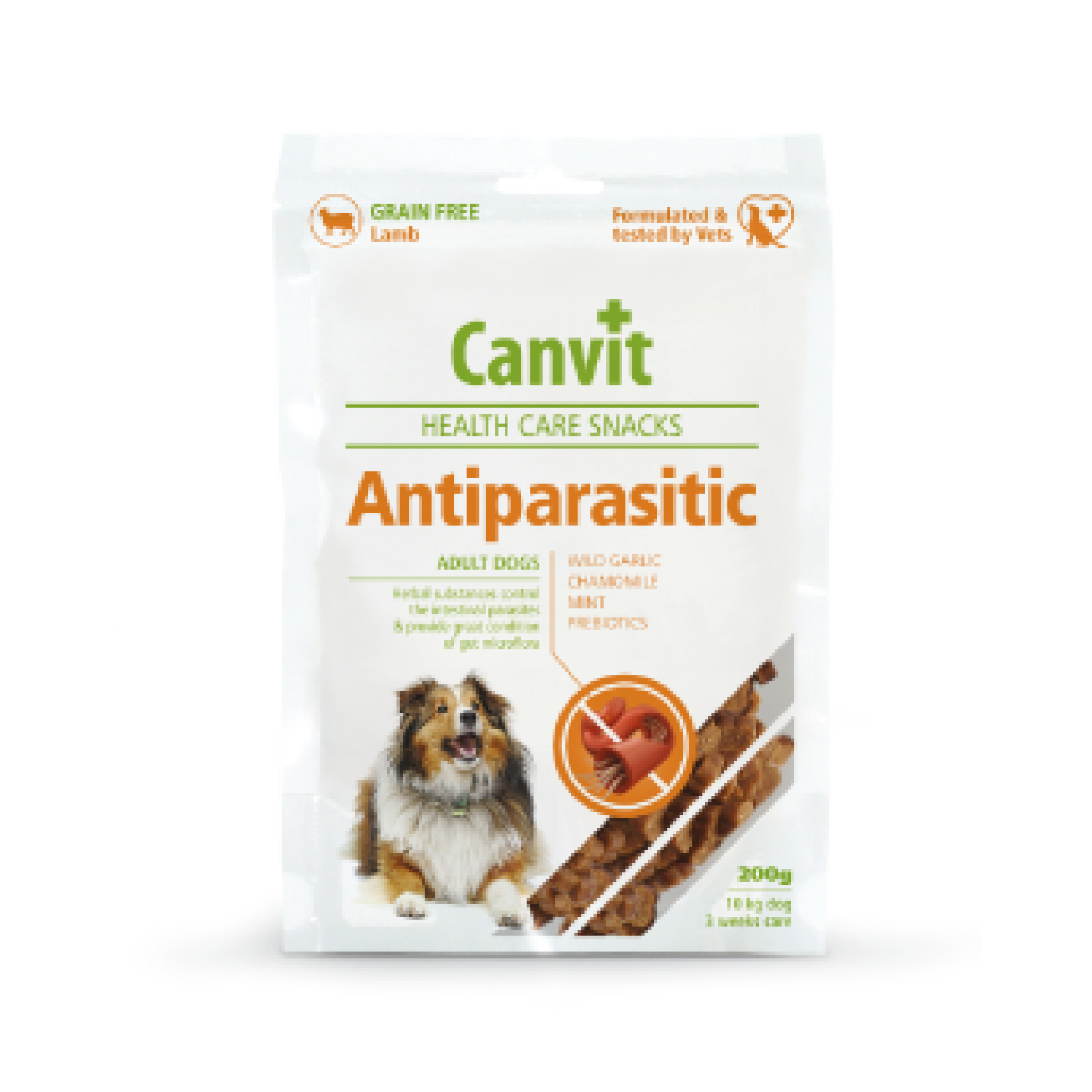 Canvit Antiparasitic напіввологі ласощі для собак з чутливим травленням з ягням.