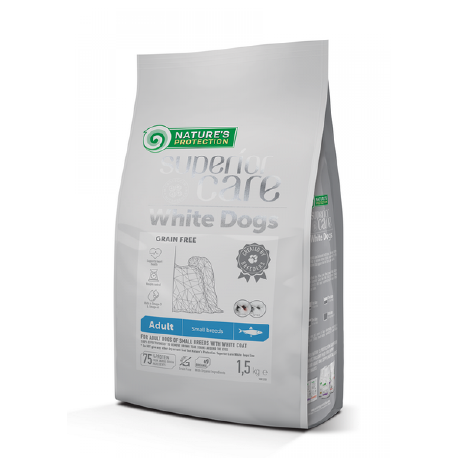 Nature's Protection White Dog Grain Free with Herring Adult Small Breed - корм cупер-преміум класу з оселедцем, розроблений спеціально для дорослих білошерстих собак дрібних порід. Виготовлений із ретельно відібраних інгредієнтів високої якості. На здорову роботу шлунково-кишкового тракту вказують нерясні та тверді випорожнення, саме з цією метою корм збагачений екстрактами юкки, пребіотиками та клітковиною. До складу сухого корму входять інгредієнти, що позитивно впливають на чутливу шкіру та травну систему собак з білим забарвленням шерсті. Високоцінний продукт не лише забезпечить організм вихованця всіма необхідними поживними речовинами, а й гарантує бездоганний стан шерсті.