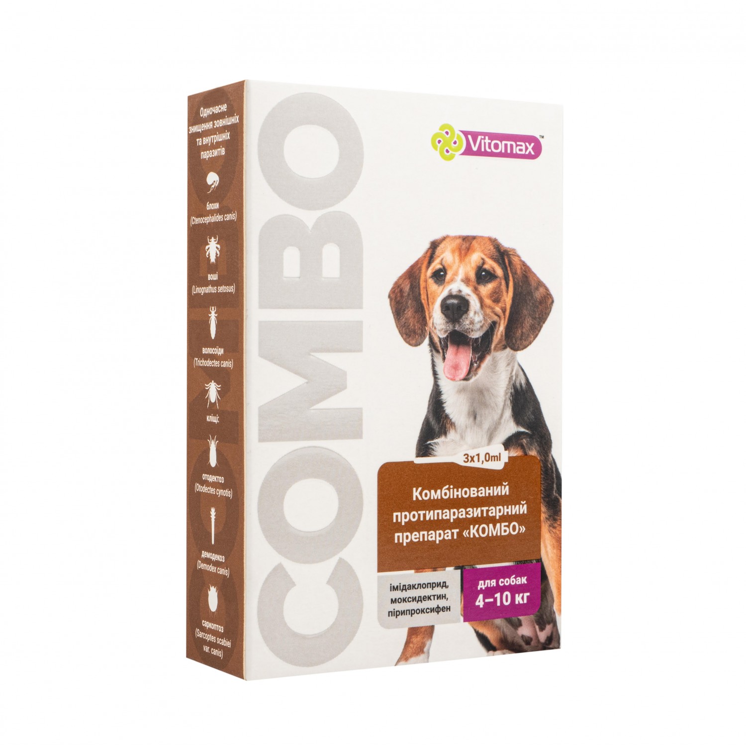 Краплі Vitomax Combo для собак від 4 до 10 кг - це ендо- та екто-паразитицид місцевого застосування. Застосовуються для профілактики та лікування тварин при ураженні блохами, вошами, волосоїдами, кліщами, нематодами дихальних шляхів та гастроінтестинальними нематодами. Використовують у комплексній терапії при лікуванні алергічного блошиного дерматиту.
