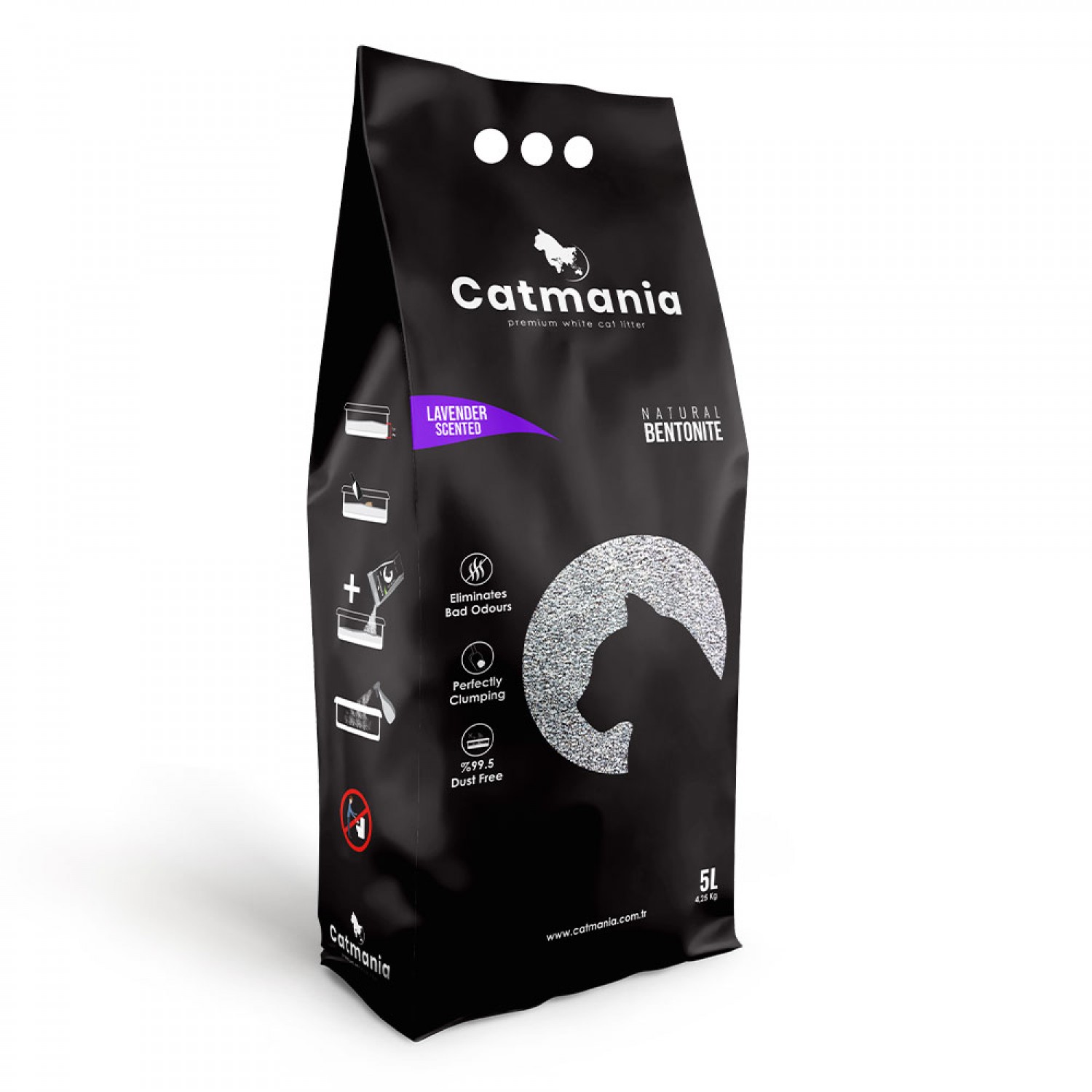 Catmania – білий природний бентонітовий наповнювач, який забезпечує чудову ефективність комкування. Наповнювач Catmania забезпечить більш комфортний та екологічний зміст вихованця. Гранули мають компактну форму, плоскі і досить тверді. Це дає чудову продуктивність для економічного і тривалого використання з ефективною боротьбою з неприємними запахами. Кольорові фіолетові гранули ароматизовані лавандою. Він має дуже високу абсорбційну здатність.