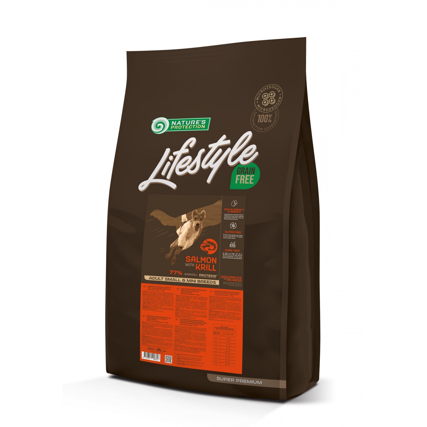 Сухий корм Nature's Protection Lifestyle Grain Free Salmon with krill Adult Small and Mini Breeds - повноцінний збалансований раціон, що задовільняє усі потреби дорослих собак малих порід. Раціон містить інгредієнти без глютену, що допомагає уникнути розладів травної системи та алергічних реакцій. Головним джерелом білка в кормі є м'ясо свіжого лосося, що не піддається попередньому заморожуванню. Також, до складу корму входить антарктичний криль, з якого Омега-3 засвоюються активніше, ніж з риб'ячого жиру.