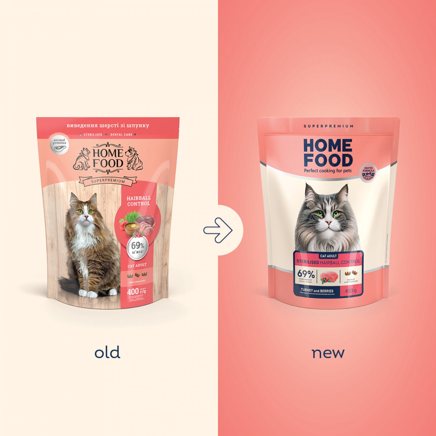 Home Food Cat Adult Hairball Control cухий корм для котів з ефектом виведення шерсті зі шлунку. Раціон на основі свіжого м'яса свійської птиці, яке є джерелом легкозасвоюваного тваринного білка та необхідних поживних речовин. Особлива форма гранули не подразнює шлунок, ефективно виводить шерсть і підходить тваринам зі слабкими яснами. Спеціальна формула корму для котів, що живуть в будинку, забезпечує відсутність запаху з лотка. Корм чудово підходить для довгошерстих порід котів, а також тваринам, які мають чутливий шлунково-кишковий тракт. Завдяки вмісту необхідних амінокислот, підходить для кастрованих котів та стерилізованих кішок. М'ясо птиці - дієтичне легкозасвоюване м'ясо з мінімальним вмістом жирів, тому підходить для тварин, схильних до набору зайвої ваги.