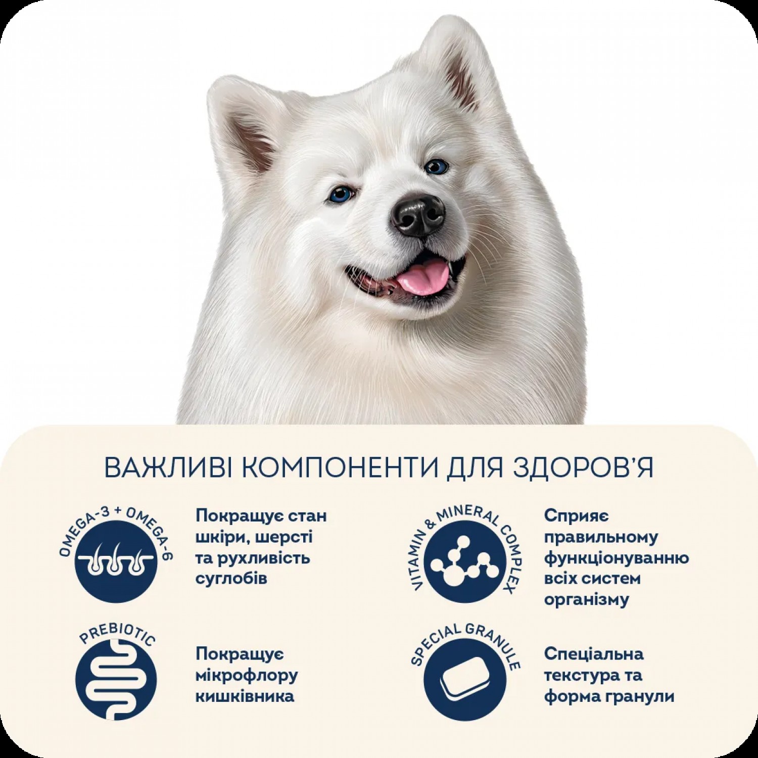 - Раціон з ідеальним співвідношенням високоякісних поживних речовин та оптимальним рівнем жирів розроблений спеціально для порід з білою шерстю.