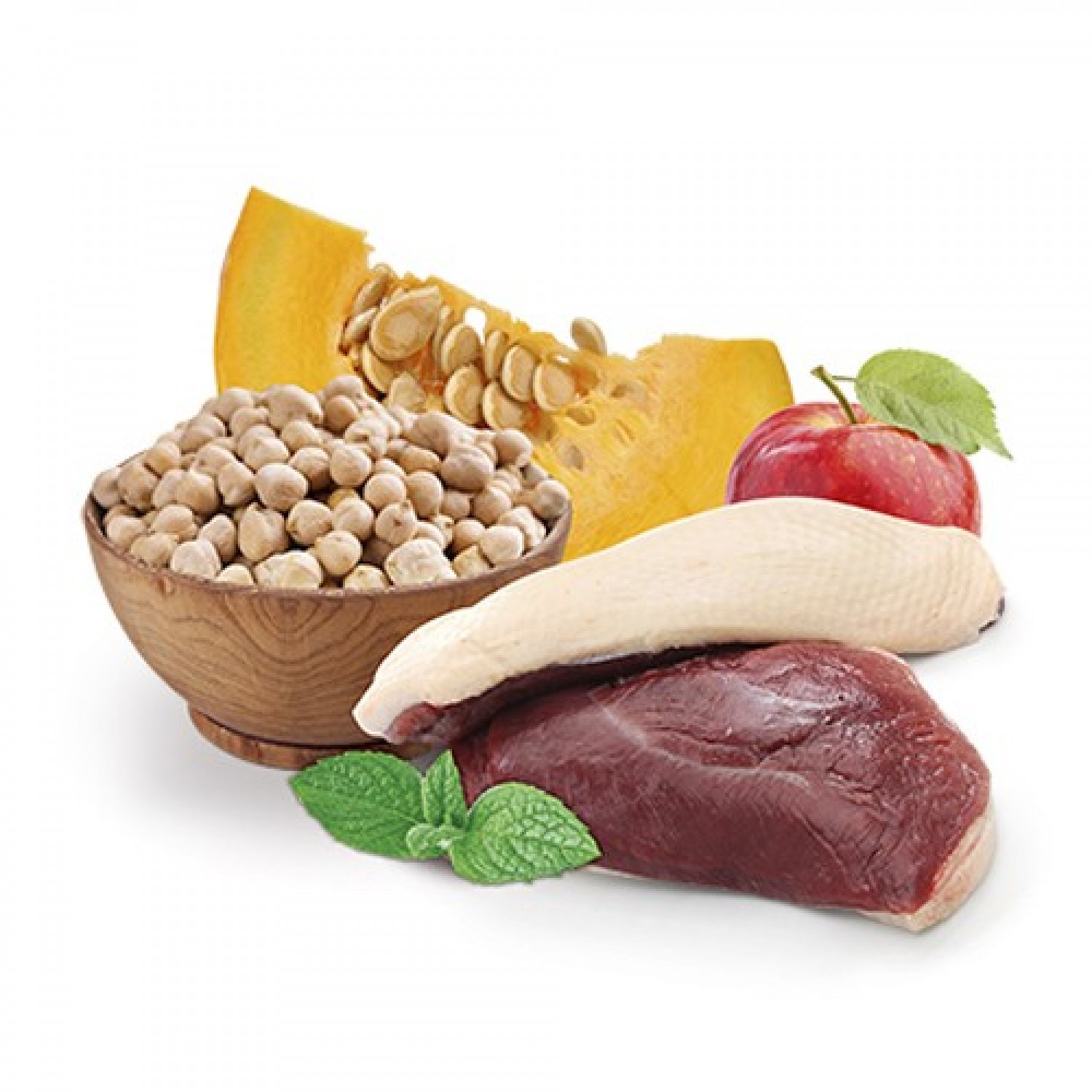Home Food Dog Adult Mini "М'ясо качки з нутом" - беззерновий гіпоалергенний сухий корм для дорослих собак. В основі гіпоалергенного корму - натуральне м’ясо качки, що є джерелом тваринних протеїнів. Наявність нуту та овочів забезпечує необхідну кількість клітковини, що позитивно впливає на шлунково-кишковий тракт тварини. Завдяки беззерновій формулі раціон рекомендований тваринам, які мають алергію на злакову групу. Рецептура розроблена спеціально для мисливських порід, собак з білим забарвленням шерсті та тварин, які живуть на вулиці. Корм має спеціальний розмір гранул - 8*8 мм, що робить його зручним в споживанні для собак міні порід.