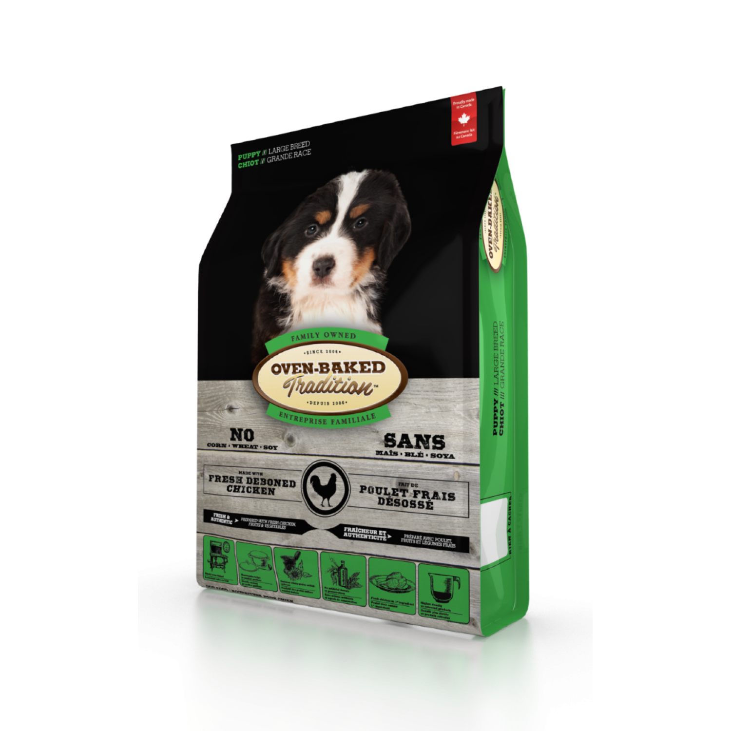 Oven-Baked Tradition повністю збалансований сухий корм для цуценят великих порід зі свіжого м’яса курятини.