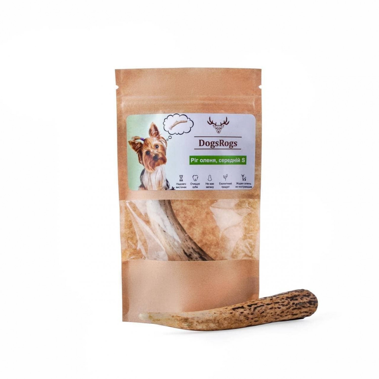 Ріг оленя середньої твердості, розмір S підійде для маленької собаки вагою 0,5 - 6 кг з середнім або високим рівнем гризучості або для цуценят більших порід зі схожими особливостями.
