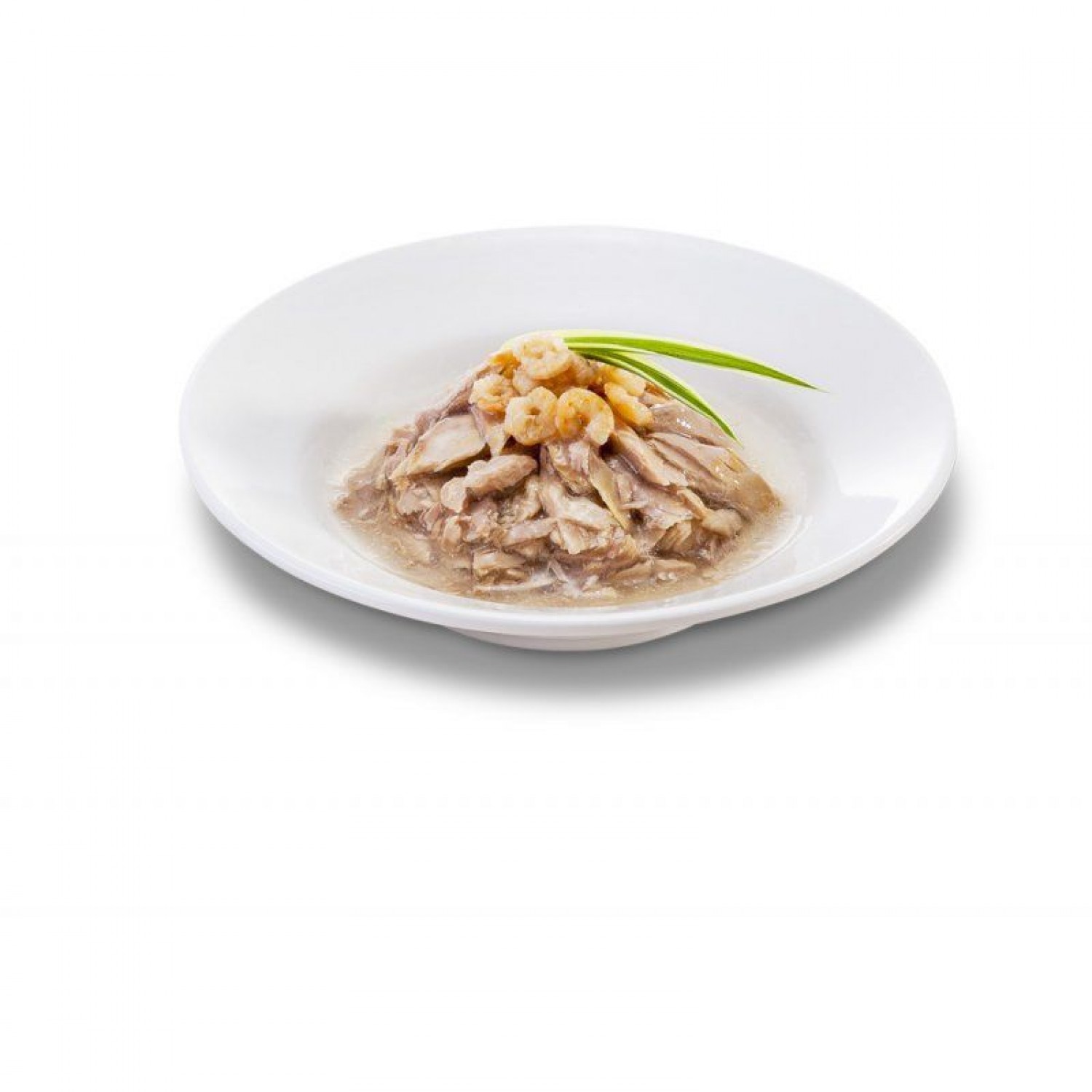 Натуральний беззерновий вологий корм у вигляді соковитих шматочків тунця та креветок в соусі. Містить особливе поєднання натуральних інгредієнтів, які сприятливо впливають на травлення та перешкоджають утворенню ковтунів шерсті у шлунково-кишковому тракті котів. Стане чудовим доповненням до основного раціону улюбленця на всіх стадіях життя.