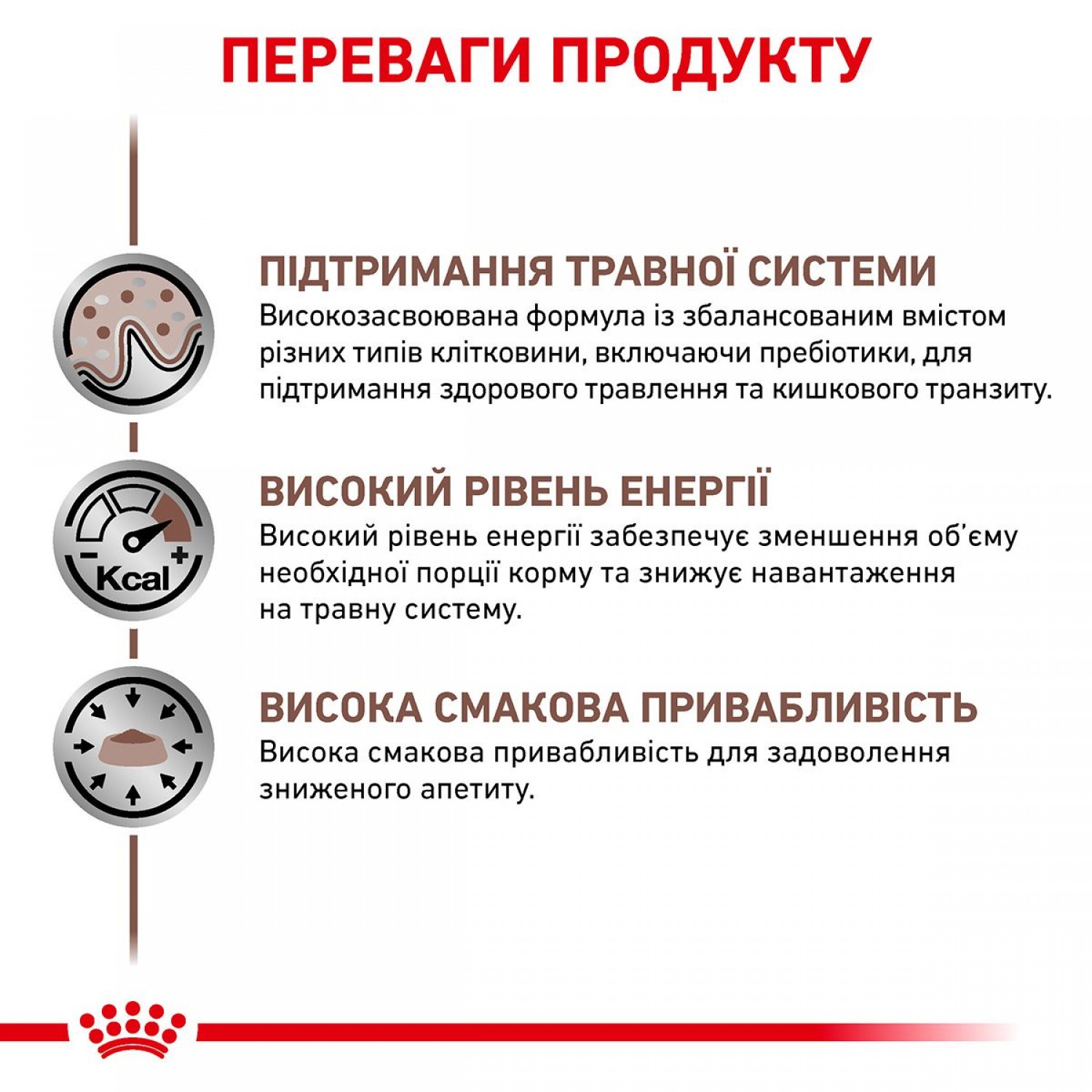 Підвищений вміст енергії відповідає енергетичним потребам собаки, дозволяє обмежити обсяг корму і знизити навантаження на шлунково-кишковий тракт, також допомагає відновити вагу в період одужання.