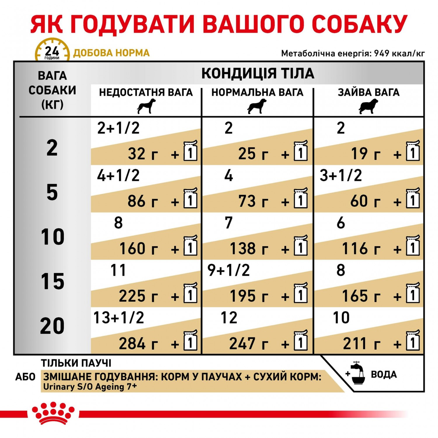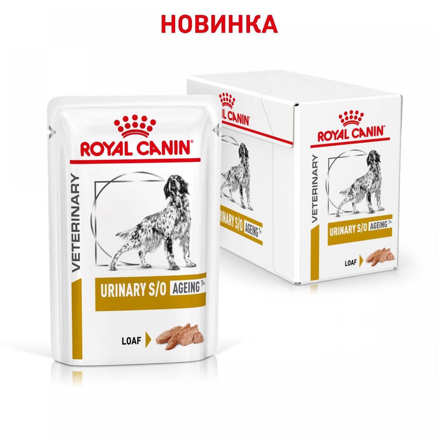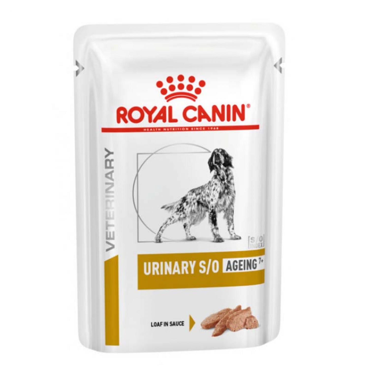 Royal Canin Urinary S/O Aging 7+ - це ветеринарна дієта для собак старше 7 років при захворюваннях сечовидільної системи. Корм виготовлений у вигляді м'ясного паштету.