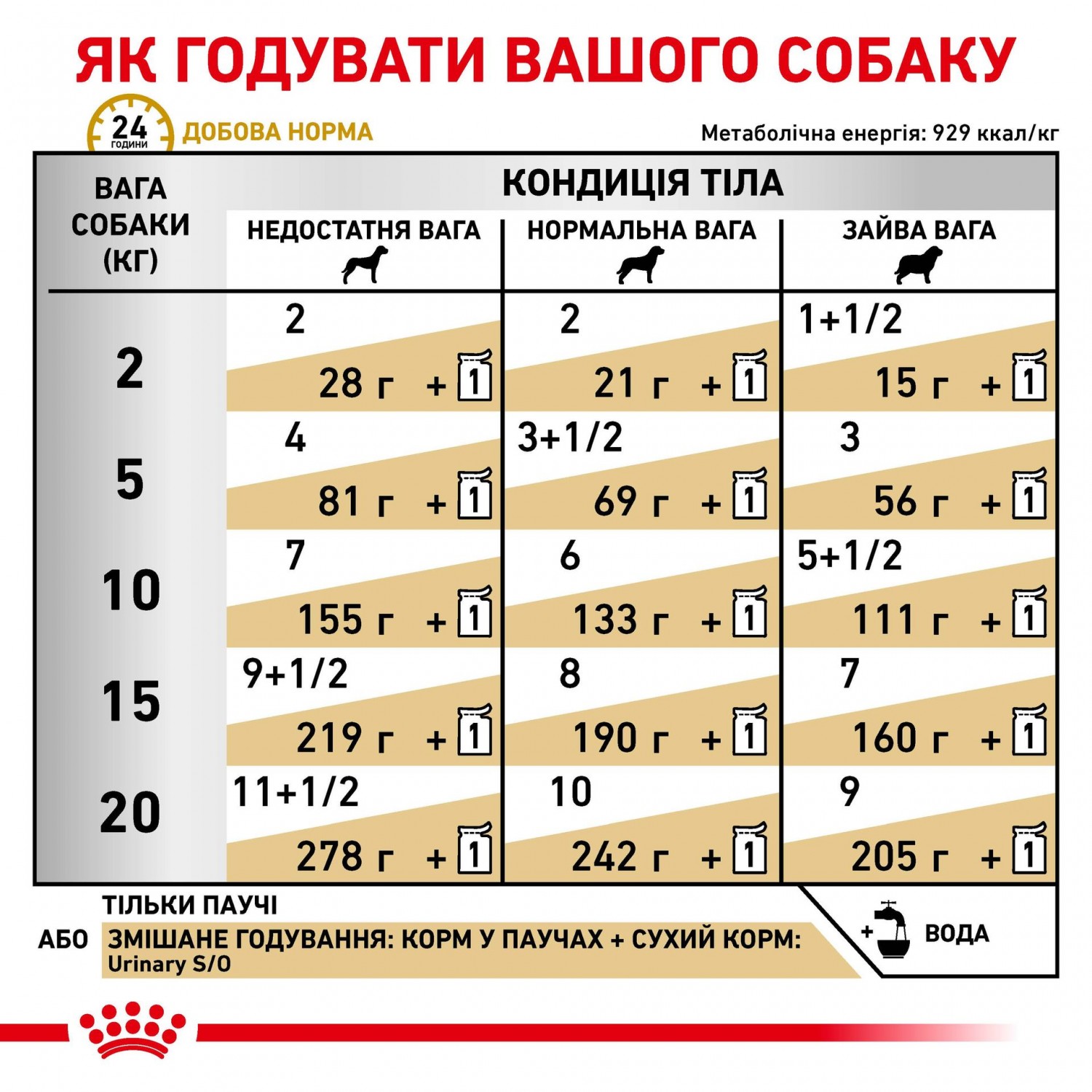 Собакам зрілого віку необхідно перевірити функціонування нирок, перш ніж рекомендувати раціон Urinary S/O. Добовий раціон рекомендується розділити на 2 годування.