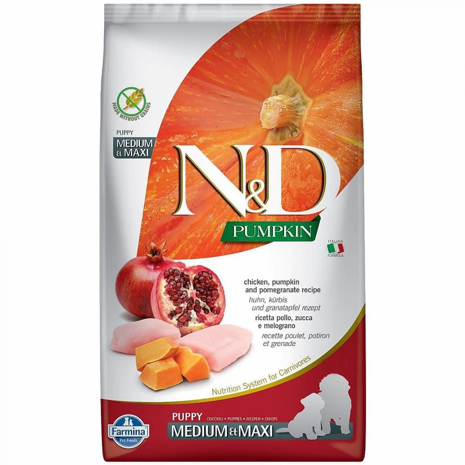 Склад: свіже куряче м'ясо без кісток (24%), дегідратований білок курки (24%), гороховий крохмаль, курячий жир, дегідратований білок оселедця, сушена гарбуз (5%), оселедець, яєчний порошок, риб'ячий жир (оселедець), горохова клітковина, сушена морква , люцернове борошно, курячі хрящі (джерело глюкозаміна і хондроітінсульфата), інулін, фруктоолігосахаріди, дріжджовий екстракт (джерело манноолігосахарідов), сушений гранат (0.5%), сушений шпинат, лушпиння насіння і насіння подорожника (0.3%), сушене яблуко, сушений апельсин, сушена чорниця, хлорид натрію, сухі пивні дріжджі, куркума (0.2%), екстракт алое вера.